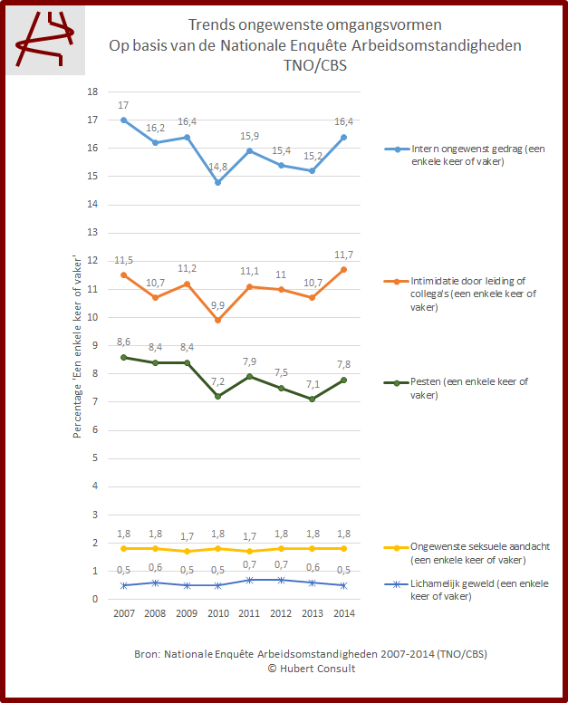 • is het percentage werknemers dat zegt een ‘enkele keer tot zeer vaak’ te maken te hebben met intern ongewenst gedrag (16,4%) toegenomen ten opzichte van 2013 (15,2%);